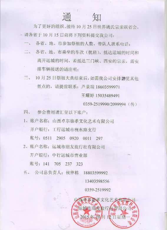 2015/10/13 9:51:08 来源:世界姚氏宗亲联谊会 编辑:管理员